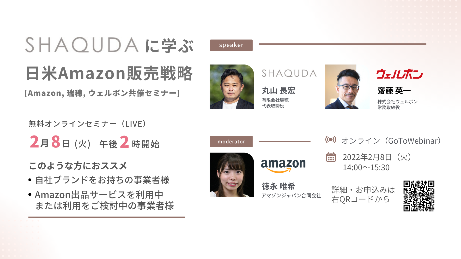 株式会社ウェルボンは2月8日(火)14時から、アマゾンジャパン合同会社様ならびにブラッシュブランド[SHAQUDA]で有名な有限会社瑞穂様とオンラインセミナーを開催いたします。