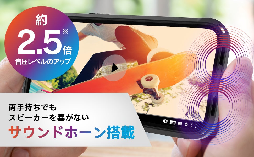 ゲームや動画視聴時、横向きに端末を持つとスピーカー部分を塞いでしまい、音がこもって聴き取りにくい。そんな不満を解消する新構造「サウンドホーン」を搭載。一般的なケースと違い、スピーカーホールの出口を端末の画面側に設計しているので、音が耳へ向かってクリアに飛びこんできます。