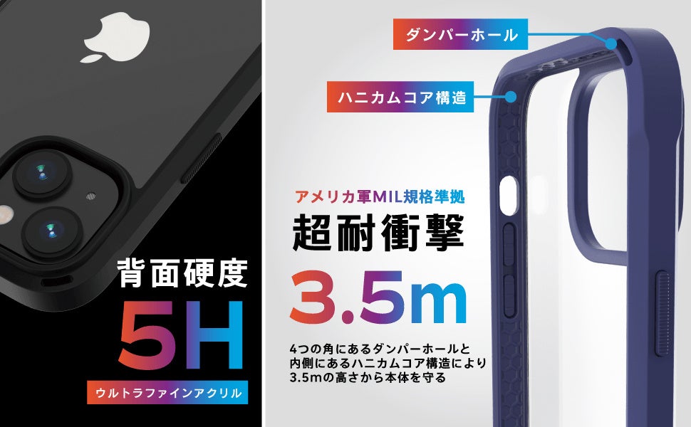 約3.5mの高さから落としても耐えられる衝撃吸収性能を持つ、ハイブリッド構造のクリアケースです。側面にはソフトなTPU、背面には表面硬度5Hのウルトラファインアクリルを使用しています。