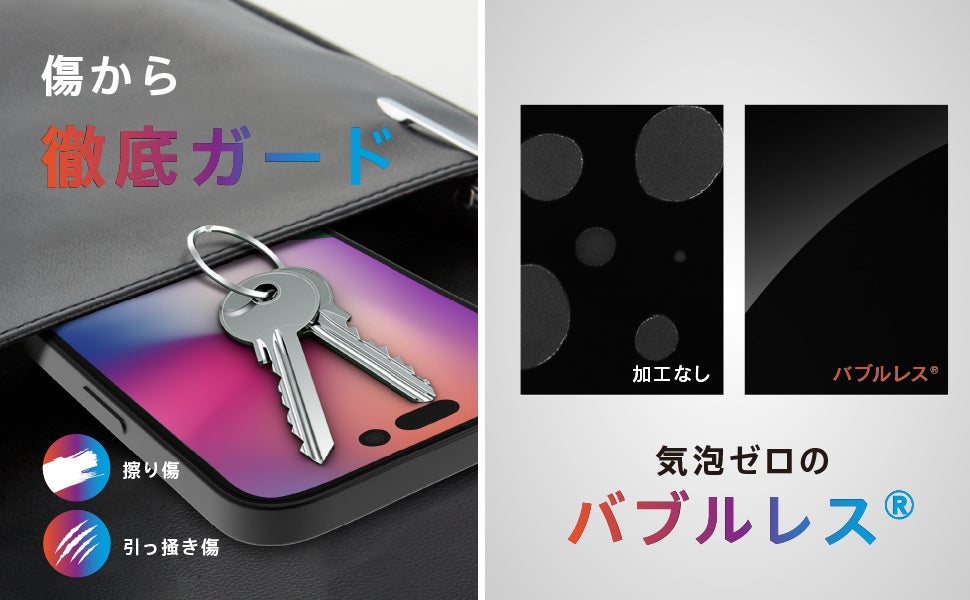 また、シリコン吸着面に特殊加工を施し、微細な埃であれば巻き込むことによって気泡を発生させずに貼り付けられる「バブルレス®」仕様です。