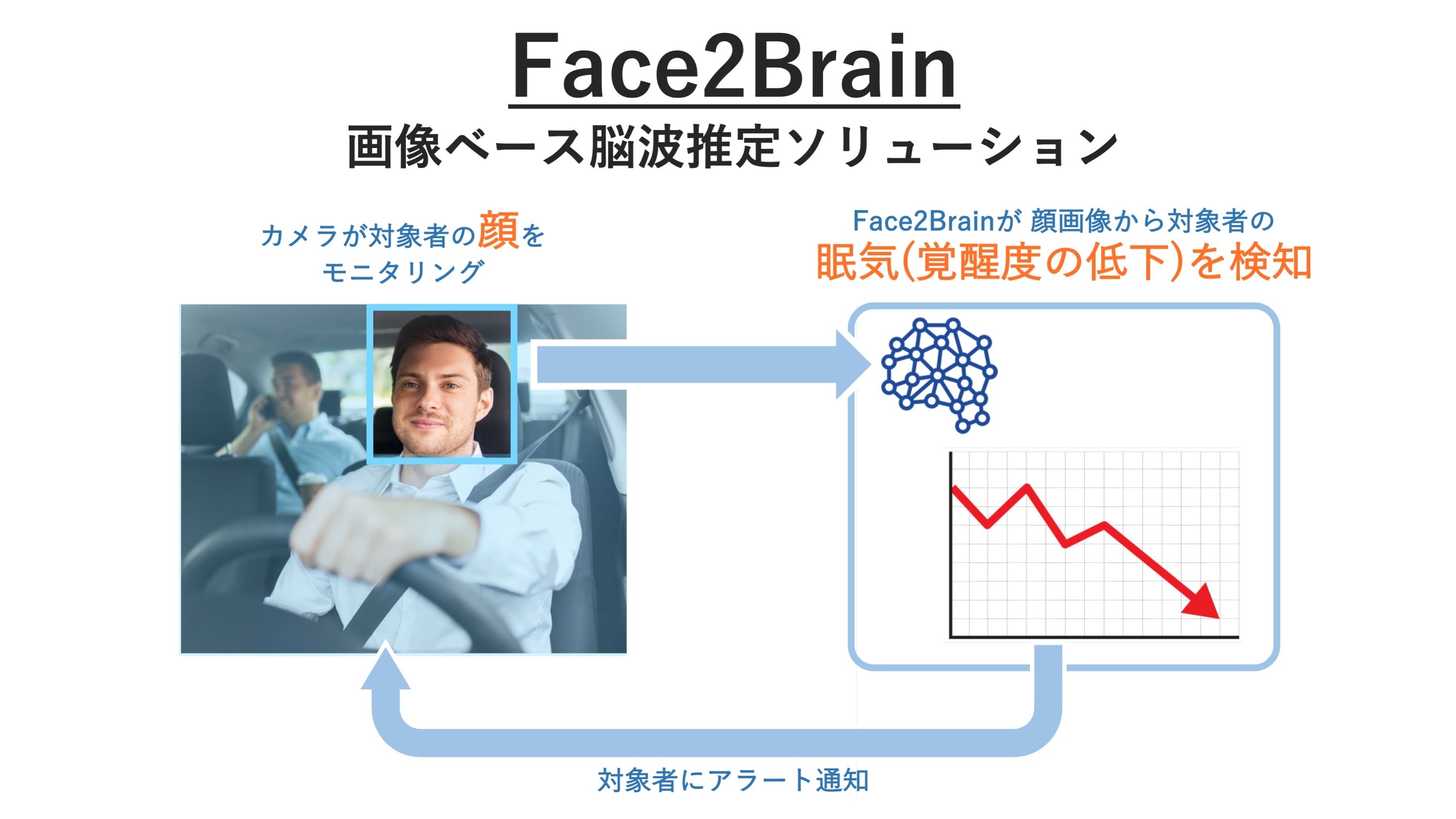 Face2Brainとは、顔画像から脳波を推定するアルゴリズムです(特許出願中)。本アルゴリズムを顔画像が取得可能な機器(車載カメラやWebカメラ付きPC等)に搭載もしくはAPI連携することで、脳波を推定し、覚醒度の低下による作業者の眠気や注意力の変化の検知が可能となります。