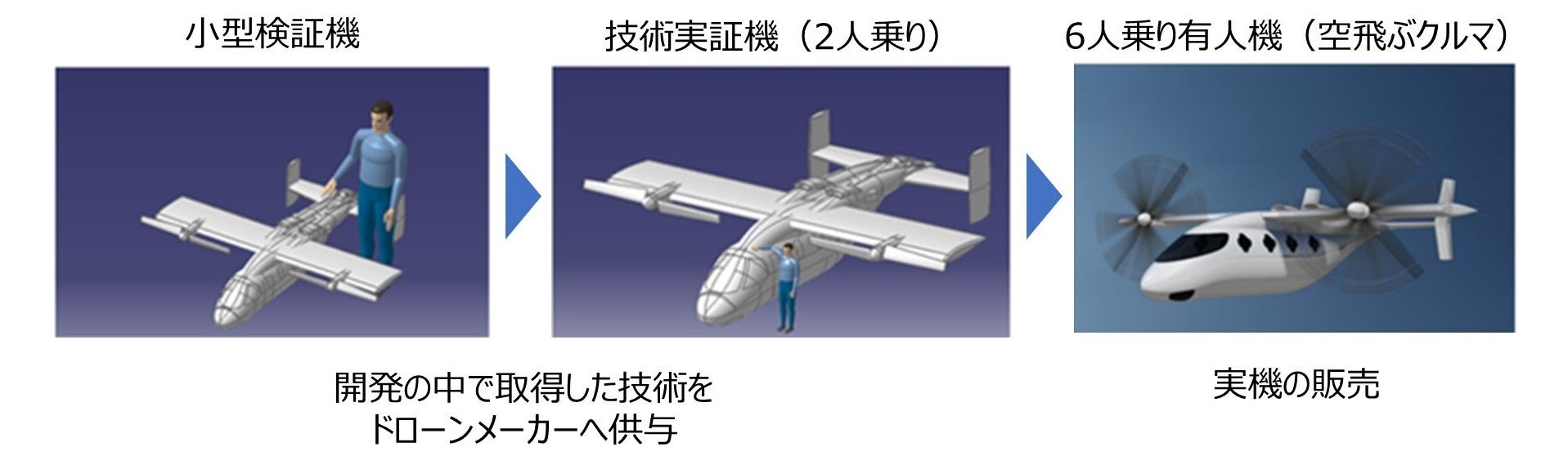 小型検証機の技術供与を行いながら、2027年には2人乗りの技術検証機の完成を、2030年代後半には6人乗り有人機を完成させ、実機の販売を行うことを目指しています。