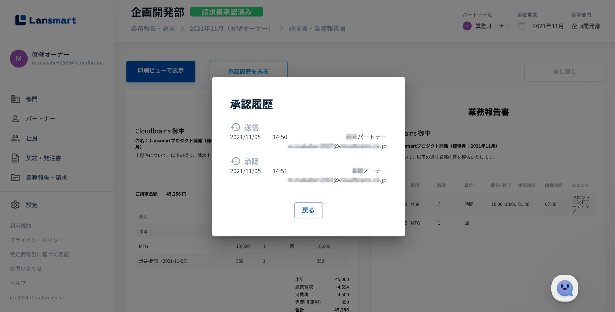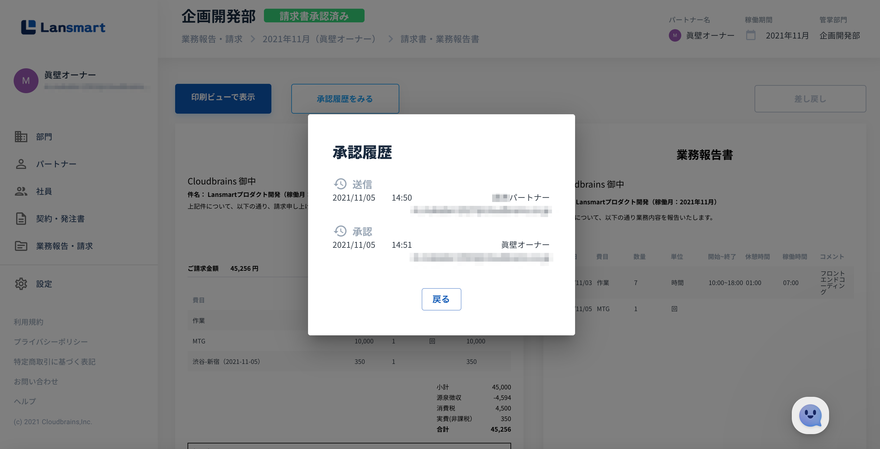 Lansmartでは、発注書や請求書の送付、承認、差し戻しにおけるすべての履歴を記録するとともに、承認されたデータについては訂正や削除ができない機能を実装しており、改正電子帳簿保存法の電子取引における「真実性の要件」を満たすことが可能です。