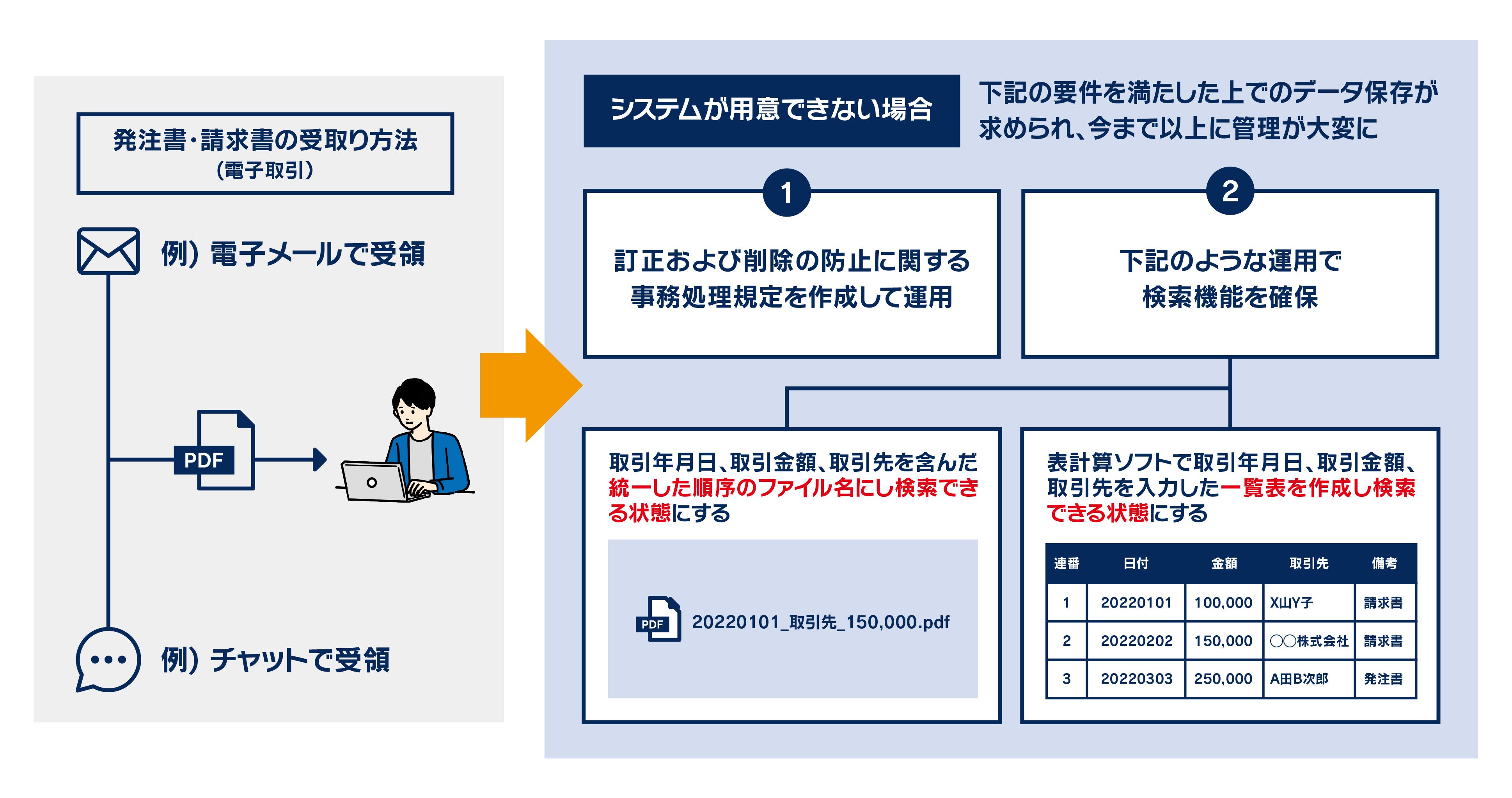 例えば、「可視性の要件」を満たすために、請求書ごとの「ファイル名の法則性」「フォルダ分けの法則性」「リストの正確性および確認の徹底」などを担保する必要があり、従来の表計算ソフトの管理ではより厳密性を問われ、さらに社内規定の作成・周知など、管理工数が増えることは必至です。