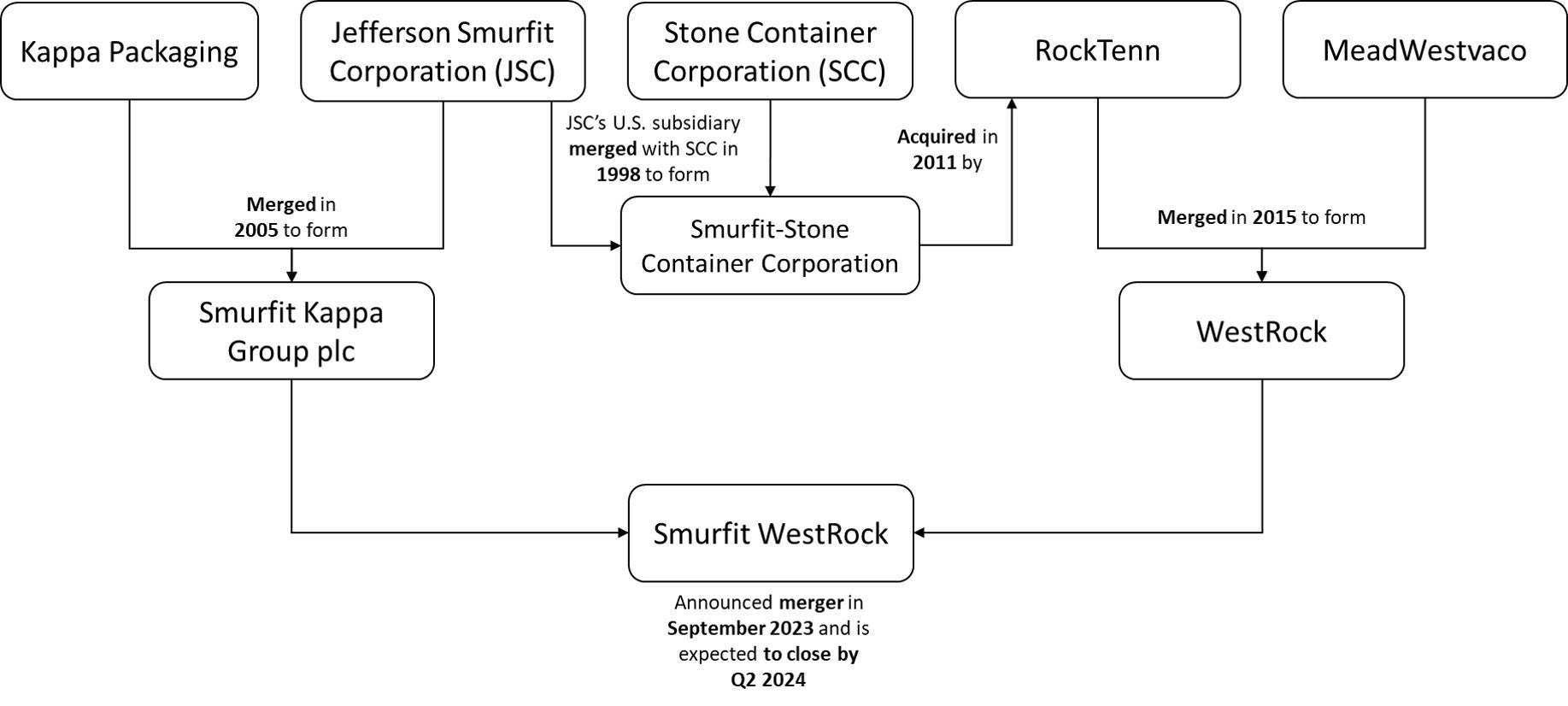 しかし、さらに興味深いのは、過去 20 年間にわたる両社の進化と、今回の契約がどのようにして Smurfit Kappa にとってどのように影響するのかということです。 同社は以前は Jefferson Smurfit Corporation として知られており、その米国子会社が Stone Container Corporation (1998 年) と合併し、Smurfit-Stone Container Corporation (SSCC) を設立しました。 買収 (2011 年) とその後の合併 (2015 年) を経て、SSCC は現在、米国で現在 WestRock として知られているものの一部を形成しています。 ヨーロッパでは、Jefferson Smurfit Corporation が Kappa Packaging (2005) と合併して、現在の Smurfit Kappa Group plc を形成しました。