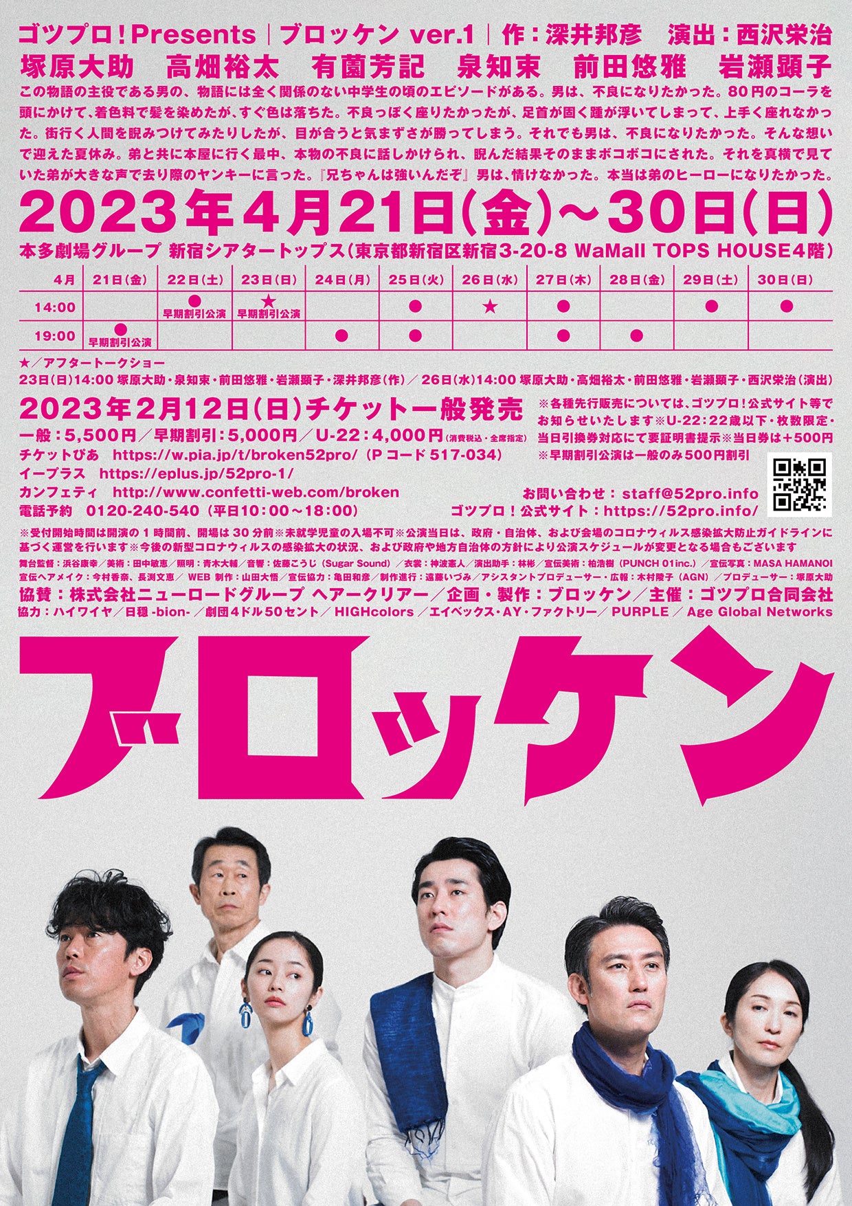 ゴツプロ!とはまた違う面白い事がしたい。そんな考えが頭をよぎった時、ブロッケンという言葉が生まれた。作家の深井邦彦氏を筆頭に初めましての役者たちが集まってくれました。新たな扉を開けた時、そこには何が待っているんだろうか。そんな冒険心と共に壊して創って、新たな可能性を見つけたいと思います。合言葉はブロッケン。