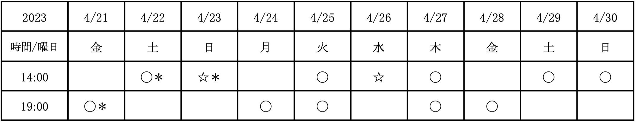 ●日程: 2023年4月21日(金)〜4月30日(日)