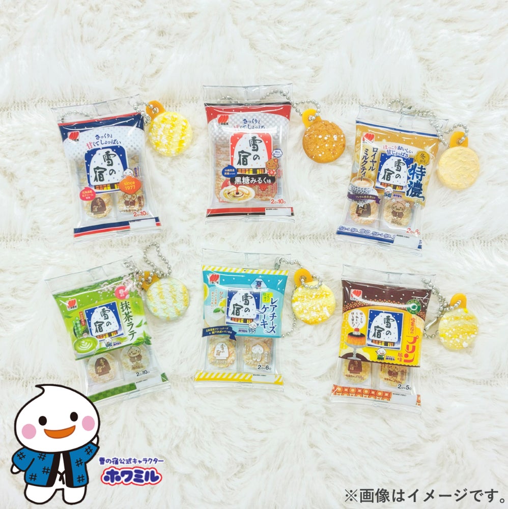 本商品は「雪の宿」ブランドから過去に発売された商品を含むパッケージ6種(雪の宿サラダ、雪の宿 黒糖みるく味、特濃 雪の宿 ロイヤルミルクティー、雪の宿 レモン香るレアチーズケーキ、雪の宿 抹茶ラテ、雪の宿 喫茶店のプリン風味)を、デザインはほぼそのまま約45mmのミニチュアに再現したもので、各パッケージには「雪の宿」のおせんべいをモチーフとしたチャームがついております。