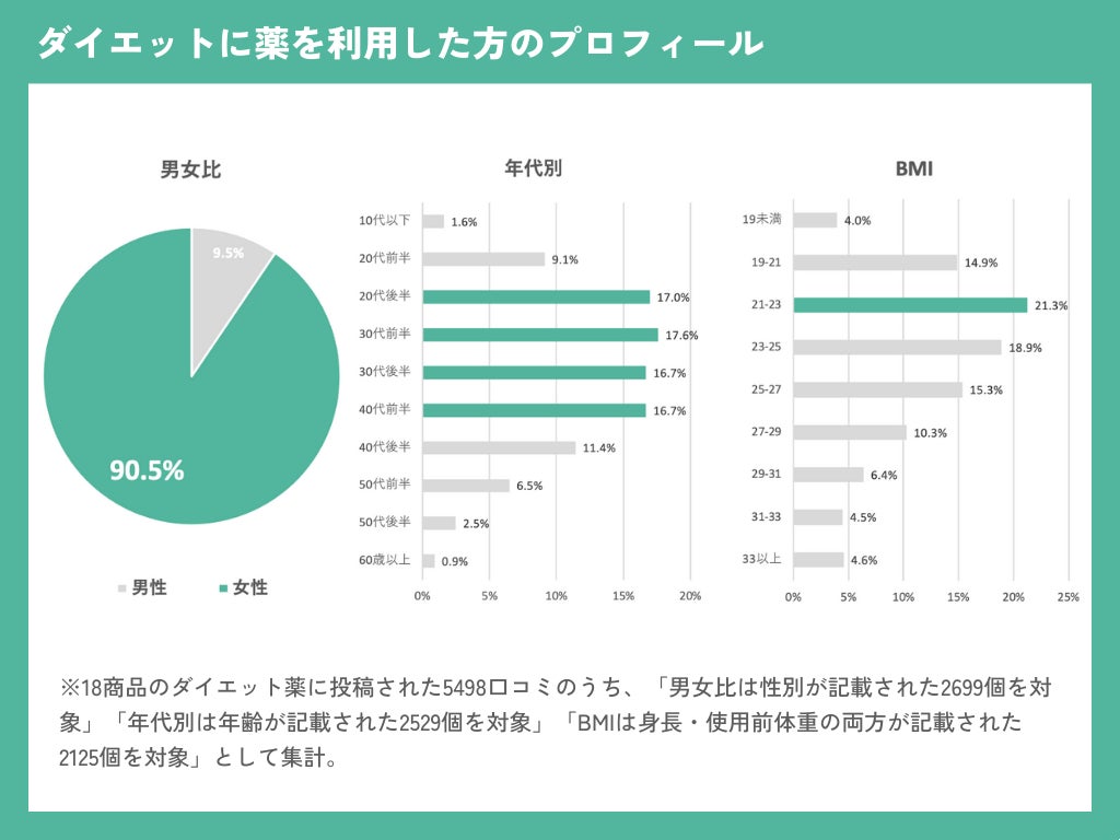 ダイエット効果を期待して薬を利用する方々のプロフィールについて、18種類のダイエット薬に寄せられた5498件の口コミを分析しました。その結果、利用者の90.5%が女性であり、年齢層は20代後半から40代前半が特に多くなっていました。さらに、肥満度指数(BMI)に関しては、健康的な標準体重(22)付近である「21-23」の範囲の方が21.3%と最も多いことが分かりました。