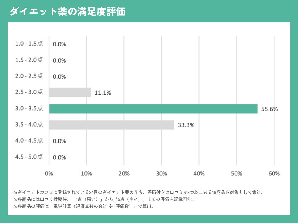 ダイエット効果が期待される18種類のダイエット薬に寄せられた5498件の口コミを分析したところ、「3.0-3.5点(少し良い)」という評価を受けている商品が最多(55.6%)であることが判明しました。加えて、「3.5-4.0点(かなり良い)」の評価を得ている商品の割合も33.3%と高くなっていました。