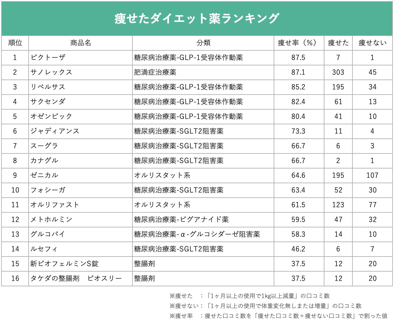 16種類のダイエット薬に関して、痩せたと報告された商品は全体の81.3%にあたる13商品でした。これは、ダイエット薬の高い有効性を示しています。特に注目すべきは、上位5商品の痩せ率が80%を超えていることです。