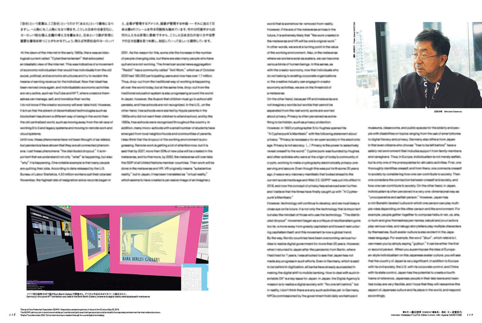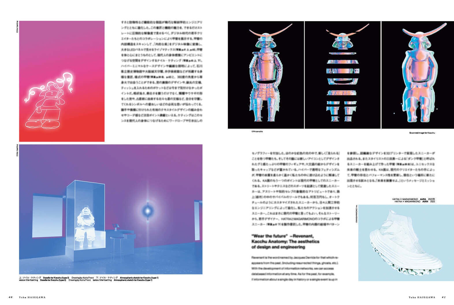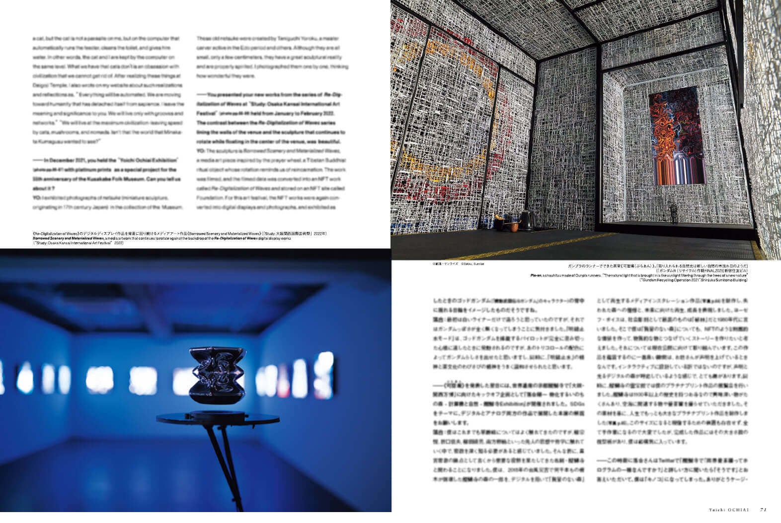 連載はメディアアーティスト落合陽一の最近の活動を写真作品とともに紹介する独占インタビューのほか、キュレーター長谷川祐子による甲冑の存在やパフォーマンス性を更新する展覧会の見どころ解説、世界的な現代アートコレクター高橋龍太郎が自身のコレクションの中でも会田誠作品にまつわる秘蔵エピソードを語る企画を掲載。また新連載として、美術ジャーナリストの鈴木芳雄が現代アートから過去の美術作品を紐解く「知新温故(第一回ダミアン・ハースト「桜」)」、世界の情報を読み解き続けてきたメディア美学者の武邑光裕だからこそ見える新世界を語る企画(第一回クリエイターエコノミーとメタバース)がスタート!