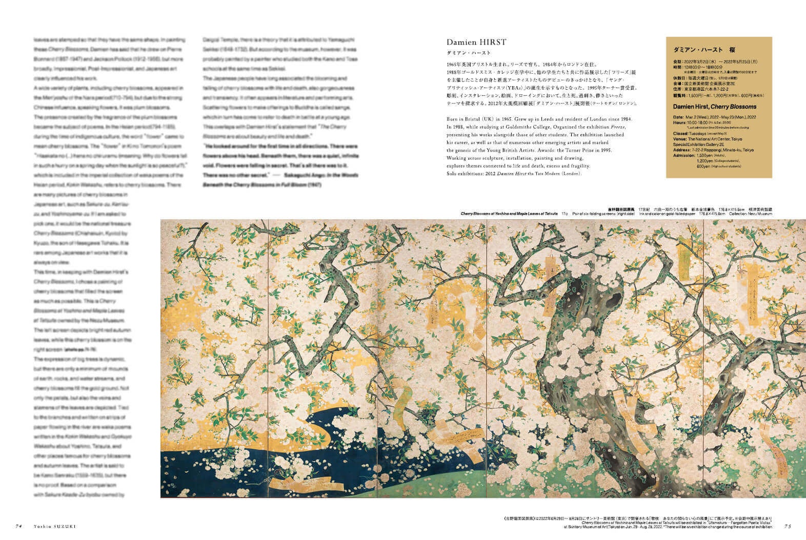 “新しき知遇を得て、古きを温ねる”。美術ジャーナリストの鈴木芳雄が、現代の美術作品をもとに、その作品に直接・間接的に影響を与えたであろう、あるいは見る側の連想をかき立てる過去の美術作品を辿り比較検証する新連載企画「鈴木芳雄の『知新温故』」。第一回は、国立新美術館での展覧会も記憶に新しいダミアン・ハーストの「桜」を題材に、サントリー美術館「歌枕 あなたの知らない心の風景」展で展示予定の《吉野龍田図屏風》(根津美術館蔵)を紹介する。