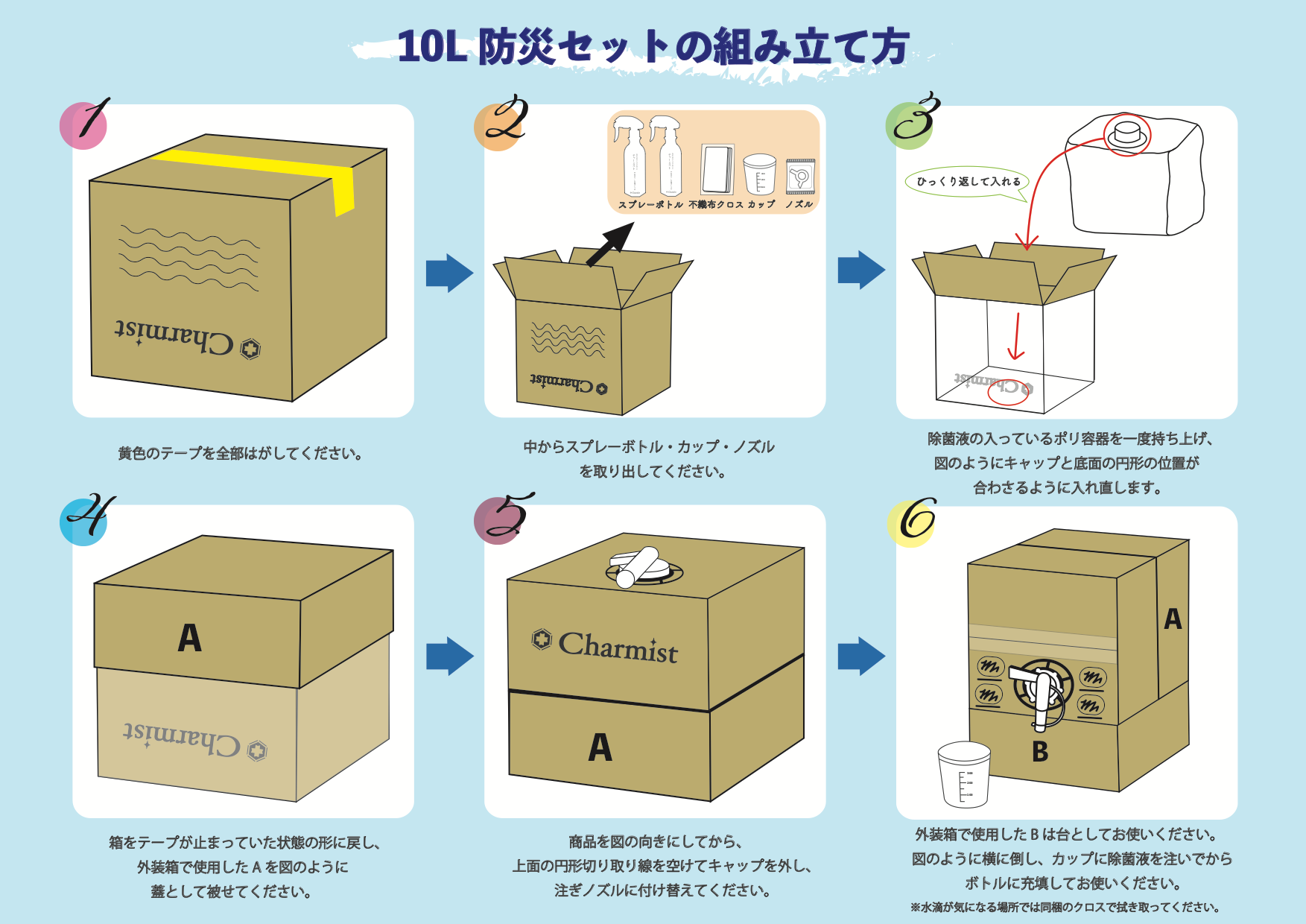 「除菌消臭剤チャーミスト10L 防災セット」の組み立て方