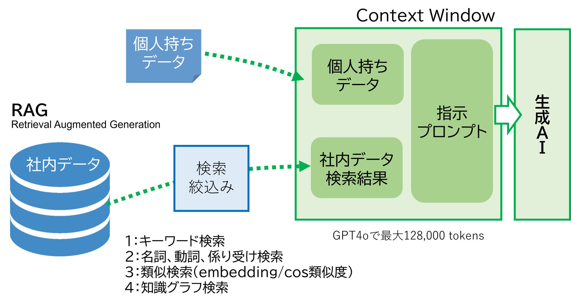 - RAGとは(Retrieval Augmented Generation)の略称です。貴社の固有データを検索できるようにして、生成AIに取り込む仕組みです。これにより、一般的になりがちな生成AIのアウトプットが、自社の文脈を組み込んだ信憑性と納得性の高いコンテンツになります。生成AIを業務に利用する場合はなくてはならない技術です。