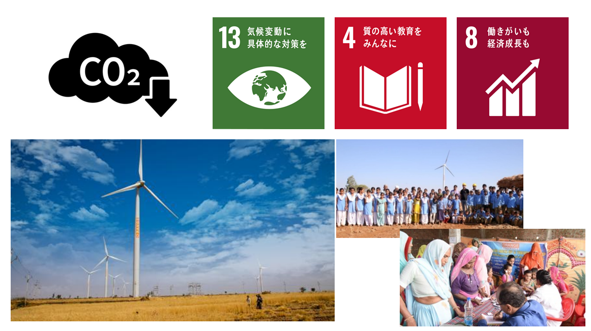 - カーボンクレジット商品を購入することで、温室効果ガスの排出削減・吸収プロジェクトの資金調達に貢献できます。商品の売上の一部は、インド中部のマディヤ・プラデーシュ州に位置する風力発電プロジェクトを支援するために活用されます。このプロジェクトは7年間で123万トンのCO2を削減、地域の学生へ奨学金の支援、地域雇用の促進に貢献しています。