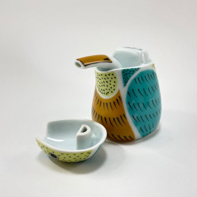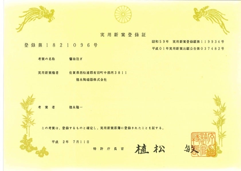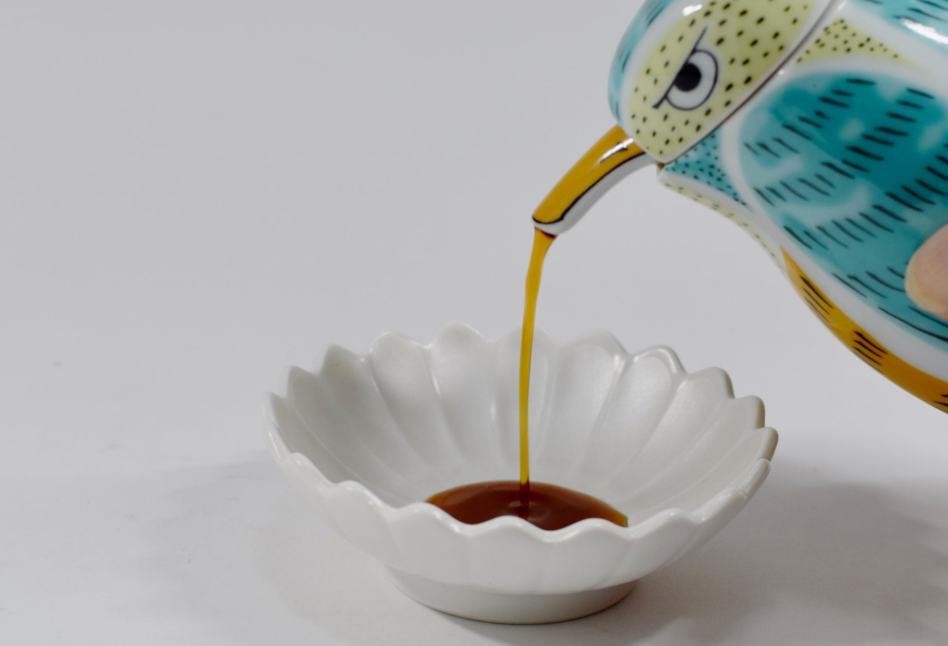 [カワセミ醤油差し シリーズ]は、前窯主4代目:徳永隆一が食卓の見栄えと機能性を両立させたいと思い昭和55年(1980年)に開発しました。その後「後引きしない醤油差し」として実用新案も取得。世代を超えて愛される有田焼を代表するロングセラー商品となりました。