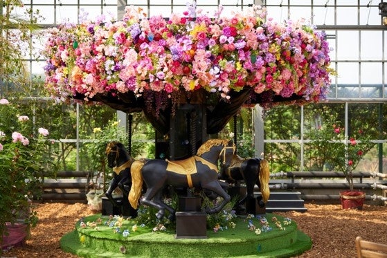 大温室に設置された3名乗りのメリーゴーランド「ブリリアント ツリー」は、昨年1年間で2,500名が乗馬を楽しんだ人気のアトラクション。昨年秋のハロウィンをテーマにした装飾に続き、この春、メリーゴーランドを装飾するアートフラワーがブルームチェンジ(模様替え)します。アートの花や果実、鉱物に彩られた世界の中、ゲストは回転する木馬に またがり、シャボン玉が飛び出すリボルバーを操ります。