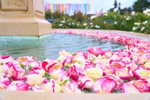 「恋人の聖地」でもあるローズガーデン。中央の整形式庭園では、バラのお花をふんだんに使用したバラ園ならではの贅沢な噴水デコレーションを実施します。お花を浮かべる体験もできます(限定数)。