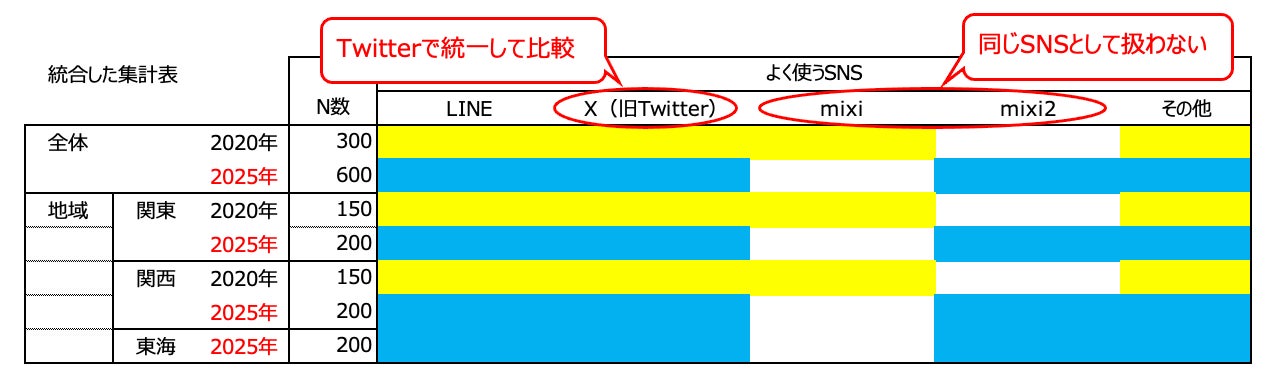 (1)~(3)の集計表の表頭や表側の増減が発生した際に、異なるデータセットから生成された集計表を統合することが可能となりました。さらに生成AIを用いることで、(4)のような名称変更「Twitter」と「X(旧Twitter)」を意味において同一SNS(項目)と自動で判断することが可能となり、手動での修正が必要としない、より高精度な比較表の作成が実現できます。