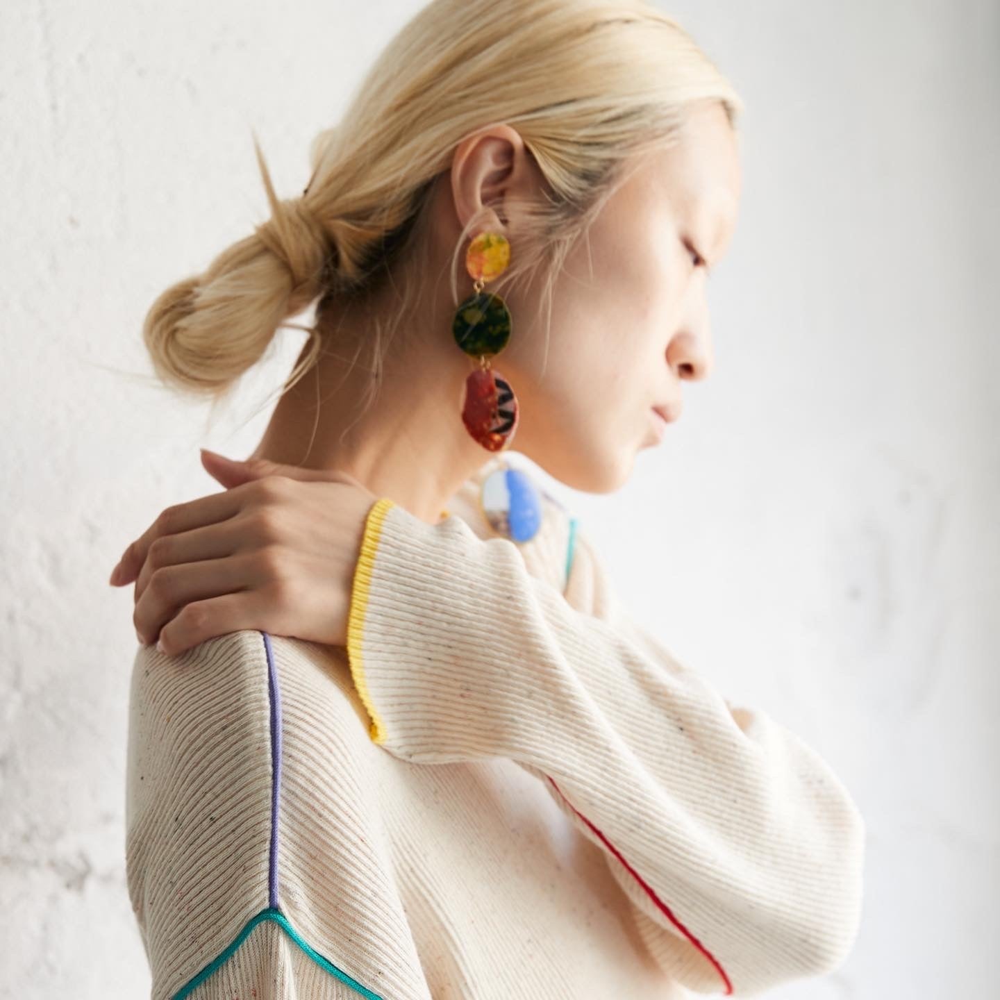 ファッション・アート・サステナブルを軸としたブランド”Atelier M/A(アトリエ・エムエ イ)”では、服づくりの工程で生まれるはぎれや糸くずにも美しさや多様性を見い出し、現代ア ート的なアプローチでファッションに落とし込む試みを続けている。あたりまえを疑い、「人工と自然」「過去と未来」など相反する要素をテーマに実験的な試みを行い、リサイクル素材 を遊びごころあふれるアイテムに昇華している。