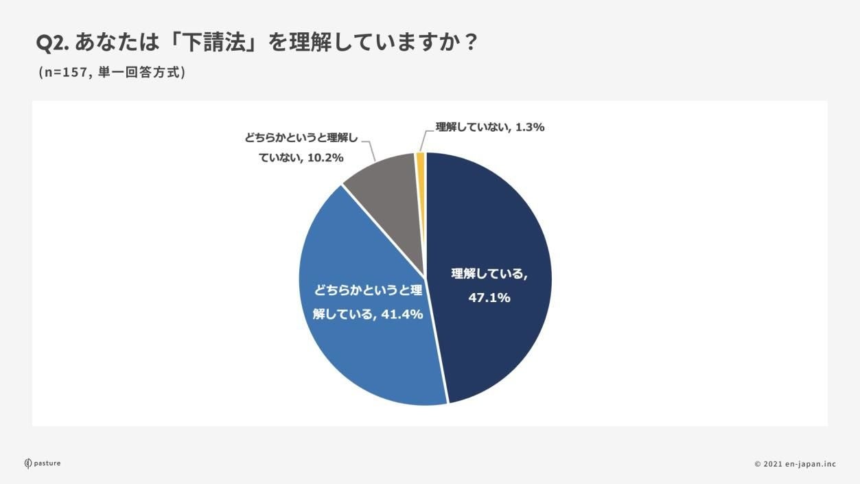 下請法を「知っている」と回答した方157名を対象に、下請法を理解しているか質問したところ、88.5%が「理解している」(理解している:47.1%、どちらかというと理解している:41.4%)と回答しました。