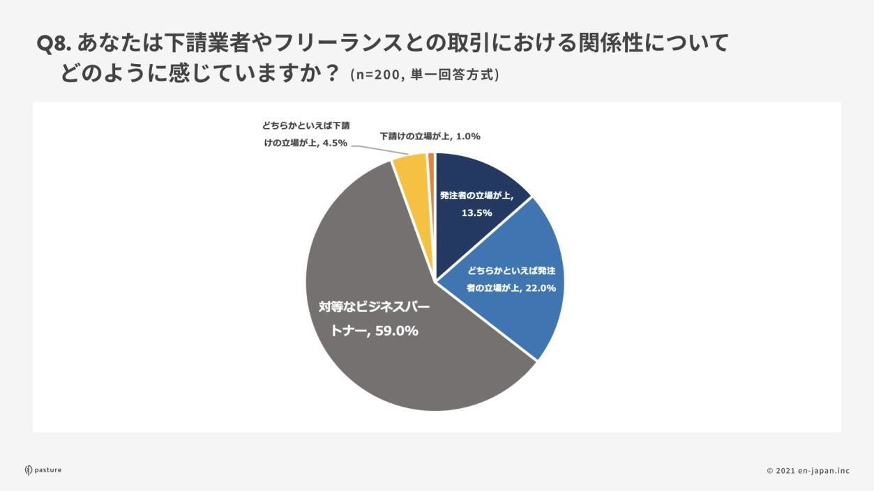 下請業者やフリーランスとの取引における関係性について、どのように感じているか質問したところ、35.5%が「発注者の立場が上」(発注者の立場が上:13.5%、どちらかといえば発注者の立場が上:22.0%)、59.0%が「対等なビジネスパートナー」と回答しました。