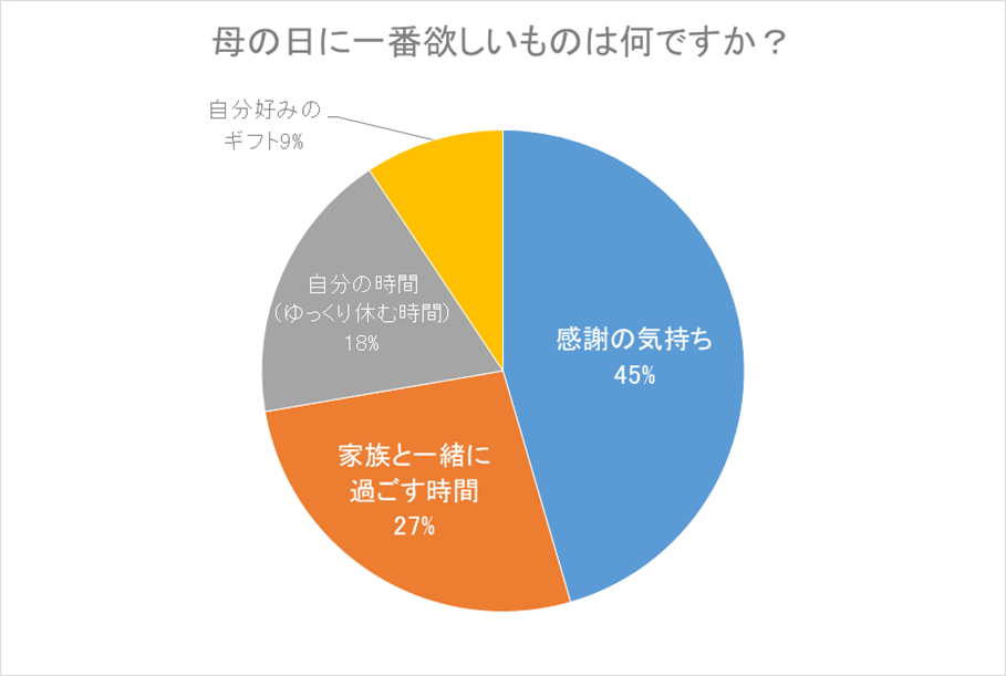 「母の日に一番欲しいものは何ですか?」という質問に対して、全体の45%の方が「感謝の気持ち」、27%が「家族と一緒に過ごす時間」と回答し、18%の「自分の時間(ゆっくり休む時間)」、9%の「自分好みのギフト」が続く結果となりました。