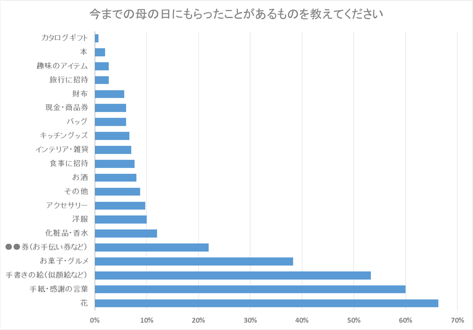 「今までの母の日にもらったことがあるものを教えてください」という質問では、「花」が最も多く、「手紙・感謝の言葉」「手書きの絵(似顔絵など)」「お菓子・グルメ」「●●券(お手伝い券など)」と続きました。