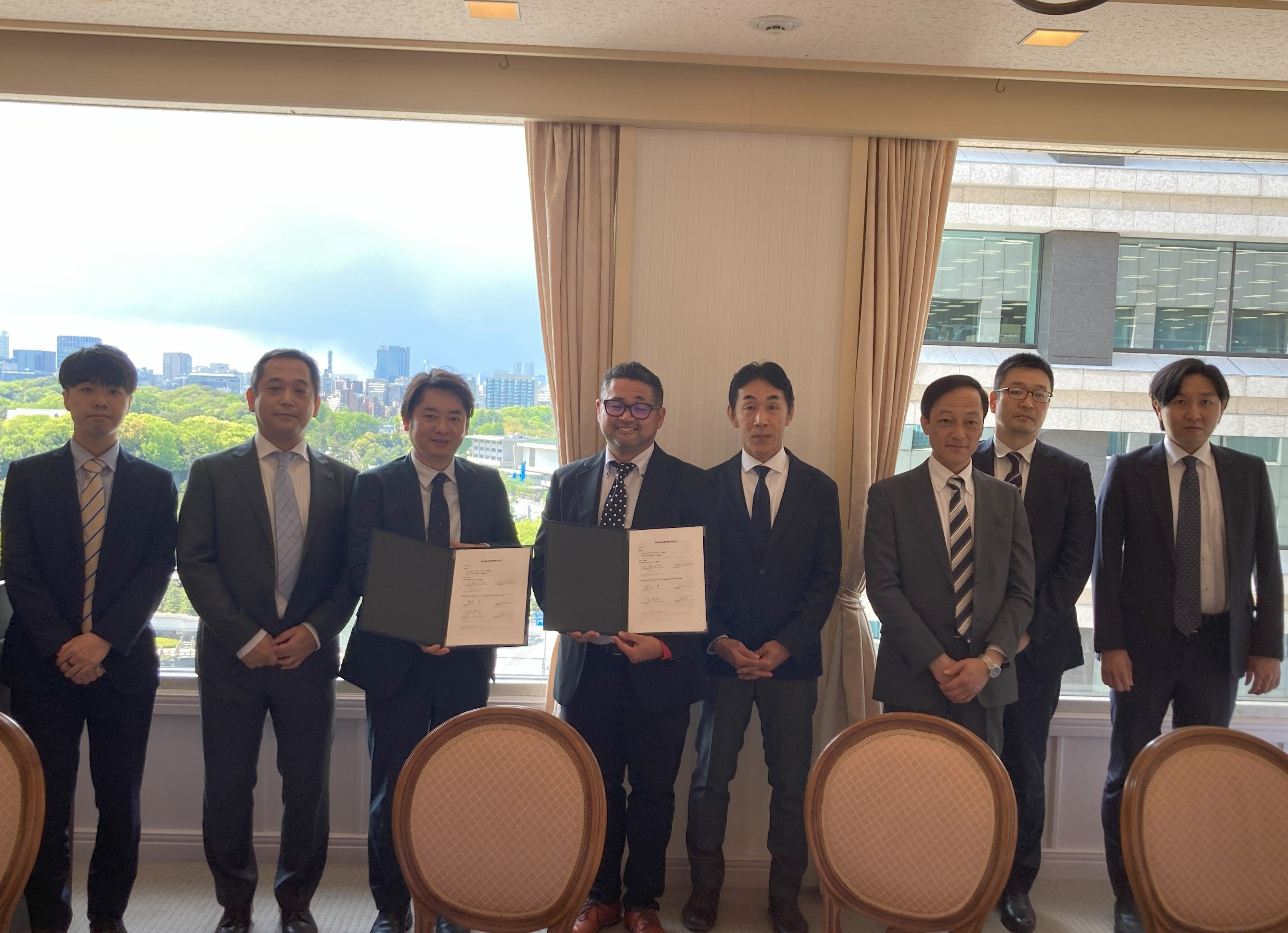 調印式に参加した(左から)パワーソリューションズ イノベーション推進部 鬼丸、Sazae COO 竹屋さん、パワーソリューションズ 社長 高橋、Sazae Director&Founder 溝尻さん、パワーソリューションズ 会長 藤田、Sazae 副社長 竹屋さん、パワーソリューションズ イノベーション推進部 部長 栗山、同部 斎藤