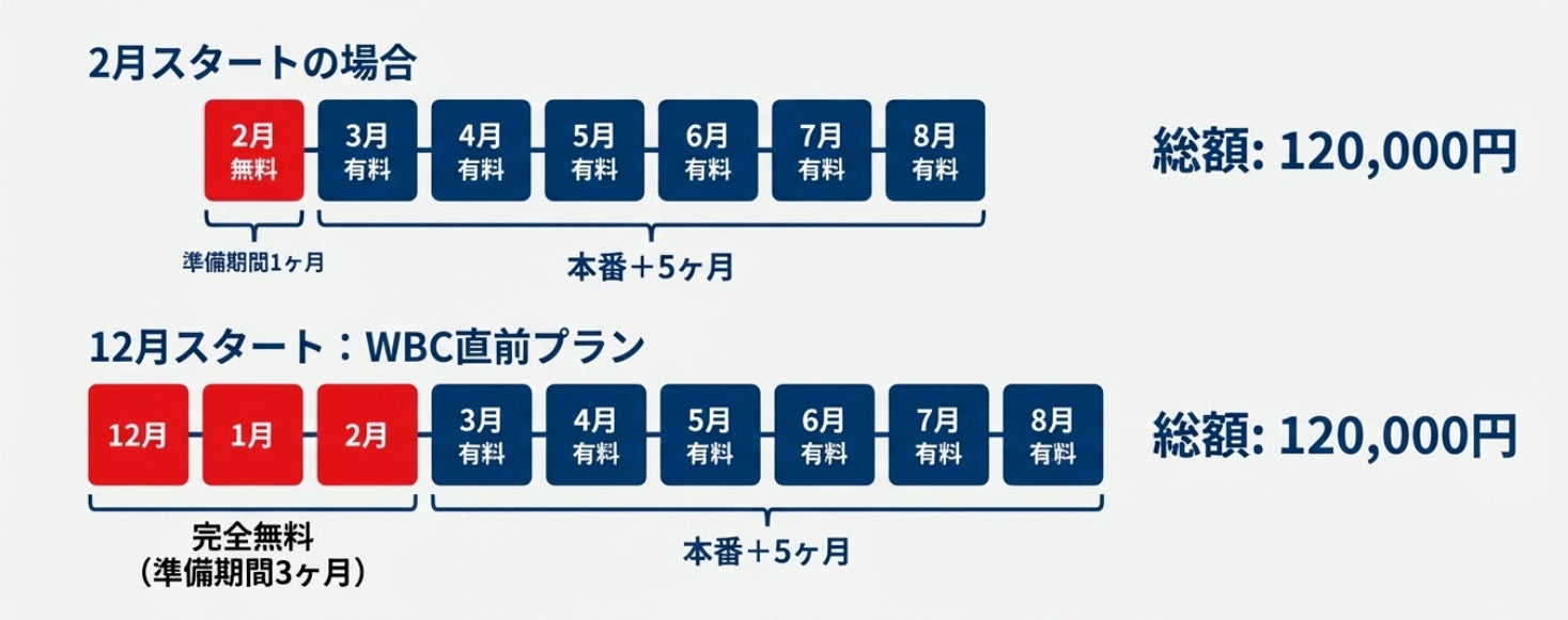 → 支払総額は同じなのに、WBC直前プランなら準備期間が2ヶ月多い