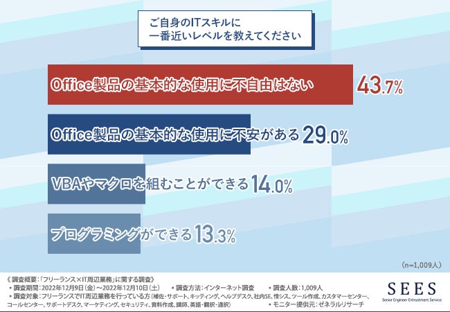 「ご自身のITスキルに一番近いレベルを教えてください」と質問したところ、『Office製品の基本的な使用に不安がある(43.7%)』『Office製品の基本的な使用に不自由はない(29.0%)』『VBAやマクロを組むことができる(14.0%)』『プログラミングができる(13.3%)』という回答結果になりました。