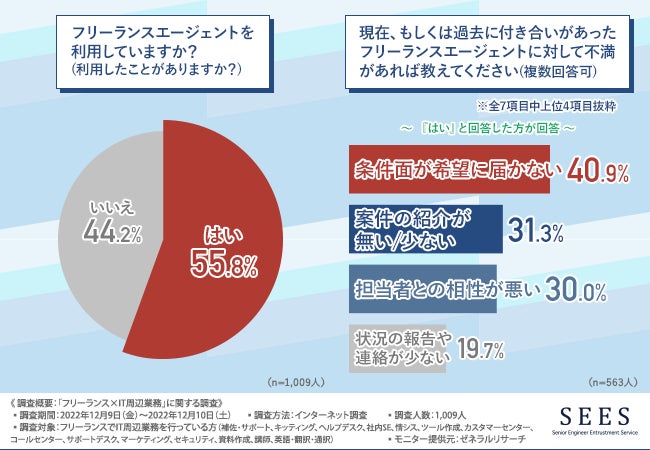 そこで、「フリーランスエージェントを利用していますか?(利用したことがありますか?)」と質問したところ、5割強の方が『はい(55.8%)』と回答しました。