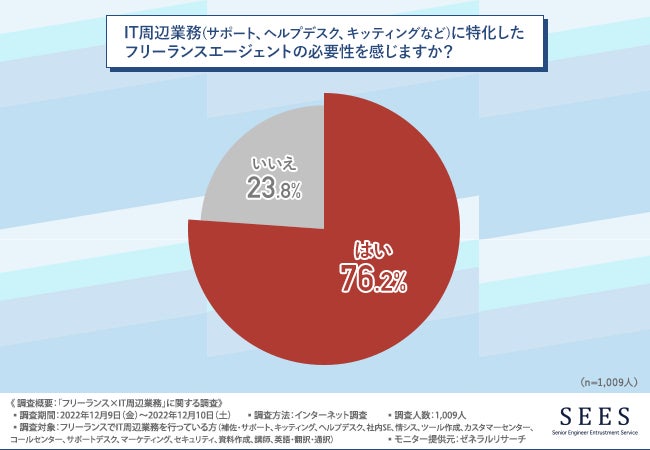 そこで、「IT周辺業務(サポート、ヘルプデスク、キッティングなど)に特化したフリーランスエージェントの必要性を感じますか?」と質問したところ、7割強の方が『はい(76.2%)』と回答しました。