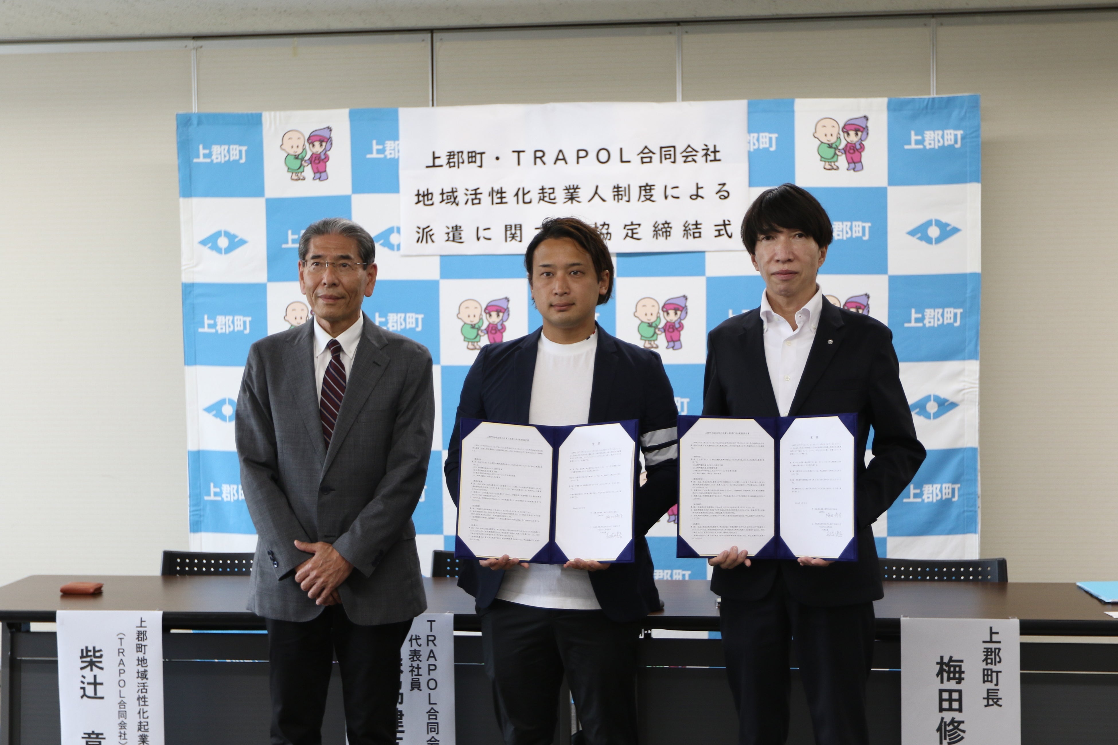 連携協定が締結された2022年9月29日には、地域活性化起業人として従事するTRAPOLの柴辻章が、上郡町役場の梅田修作町長を訪問し、「上郡町の自然に恵まれた雰囲気は変えずに中身を変えて若い人達が来たくなる町、そして住みたくなる魅力溢れる町づくりをしていきたい」と今後の取り組みについて伝えました。梅田町長からは「私もそのように感じていました。是非TRAPOLのノウハウをお借りして上郡を魅力あふれる町に発展させていきたい」と激励の言葉をいただきました。