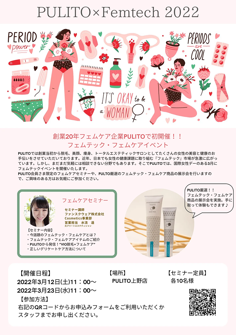 2022年に最も注目されると予想される、女性の健康課題解決の取り組みである『フェムテック・フェムケア』について、ついて分かりやすく解説するセミナーを開催いたします。当日はプリート厳選のフェムケアアイテムの展示も実施いたします。