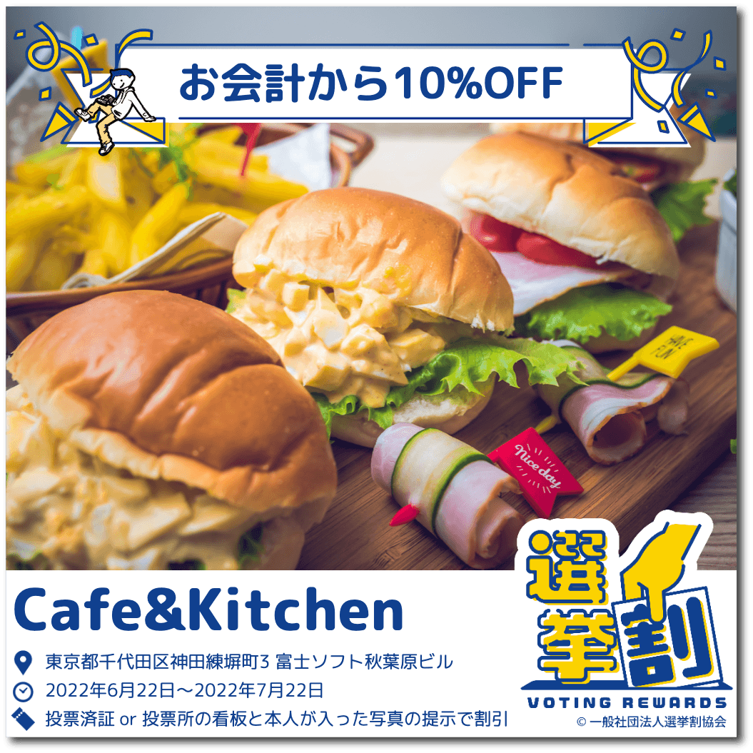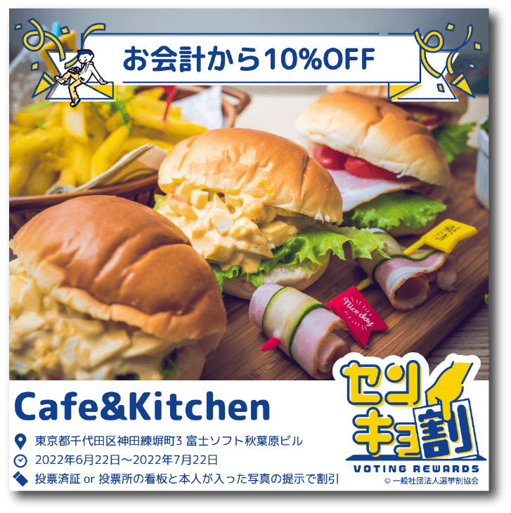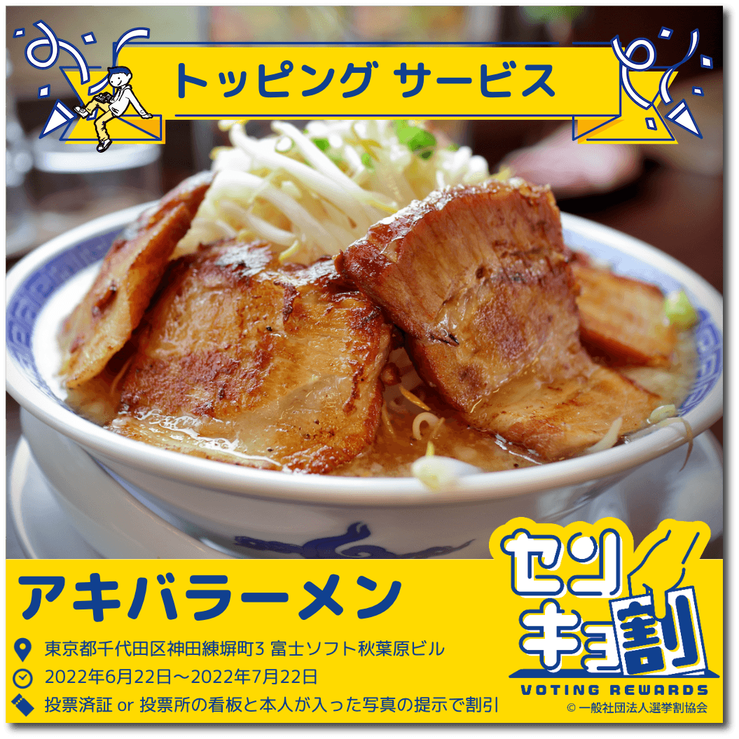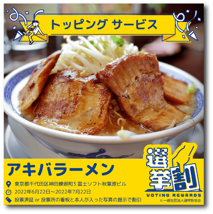 ※特定の候補者や政治団体を応援する店舗や企業が割引を行う場合、票の獲得や誘導と見做され買収罪となる可能性があります。公職選挙法を遵守したうえでご参加いただきますようお願いいたします。