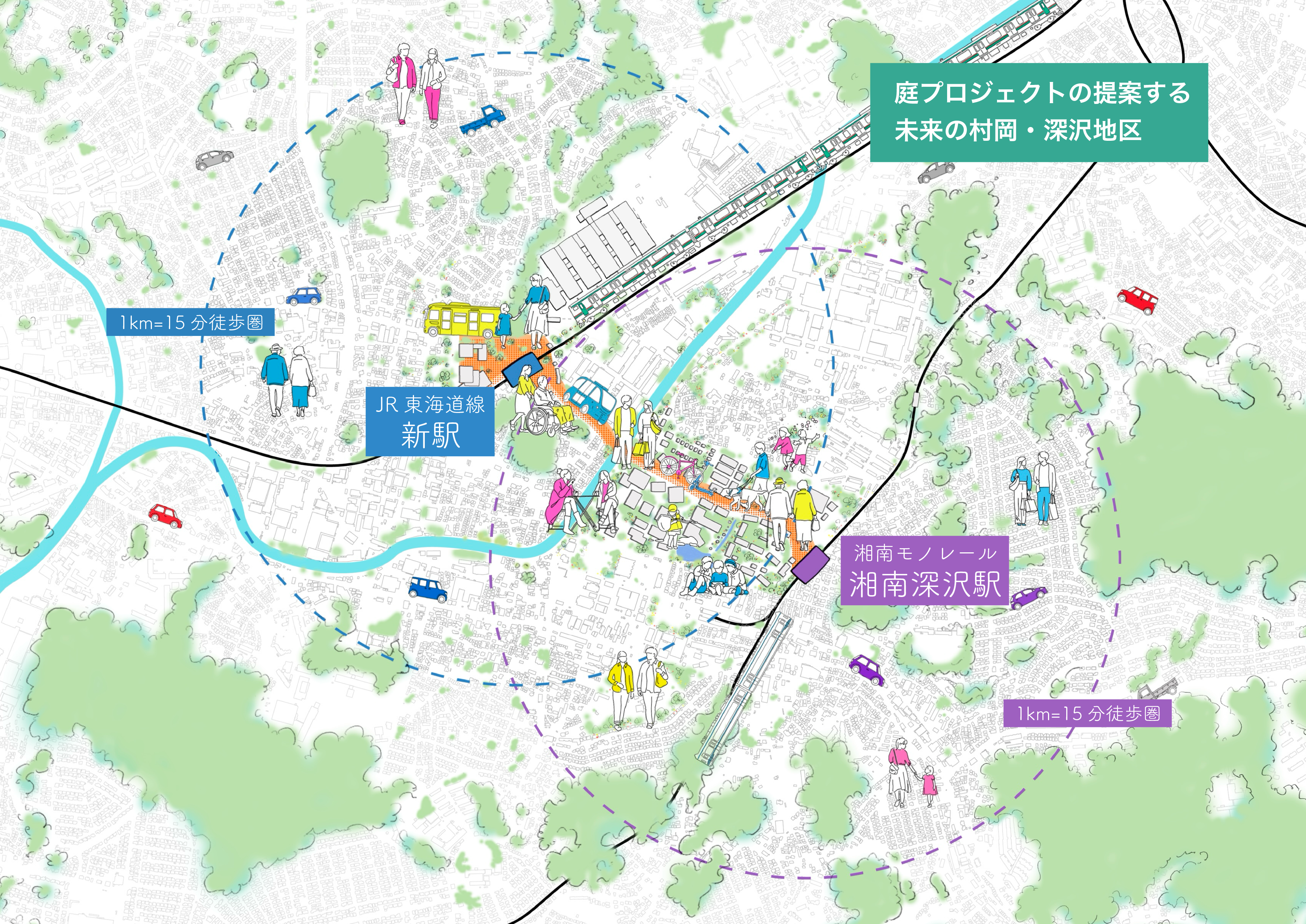 現計画では、湘南モノレールの湘南深沢駅とJR村岡新駅(仮称)とをつなぐ約1.1キロの「シンボル道路」が、再開発地区のメインストリートとして新設される予定です。「庭プロジェクト」ではこの「シンボル道路」を自動車ではなく、人間中心の「歩ける道」にすることを提案。休日に歩きたくなる1キロメートル、あるいは平日の仕事や子育ての用事の「ついで」に歩きたくなる1キロメートル……約15分の楽しい体験を市民の財産にすることを目的としています。
