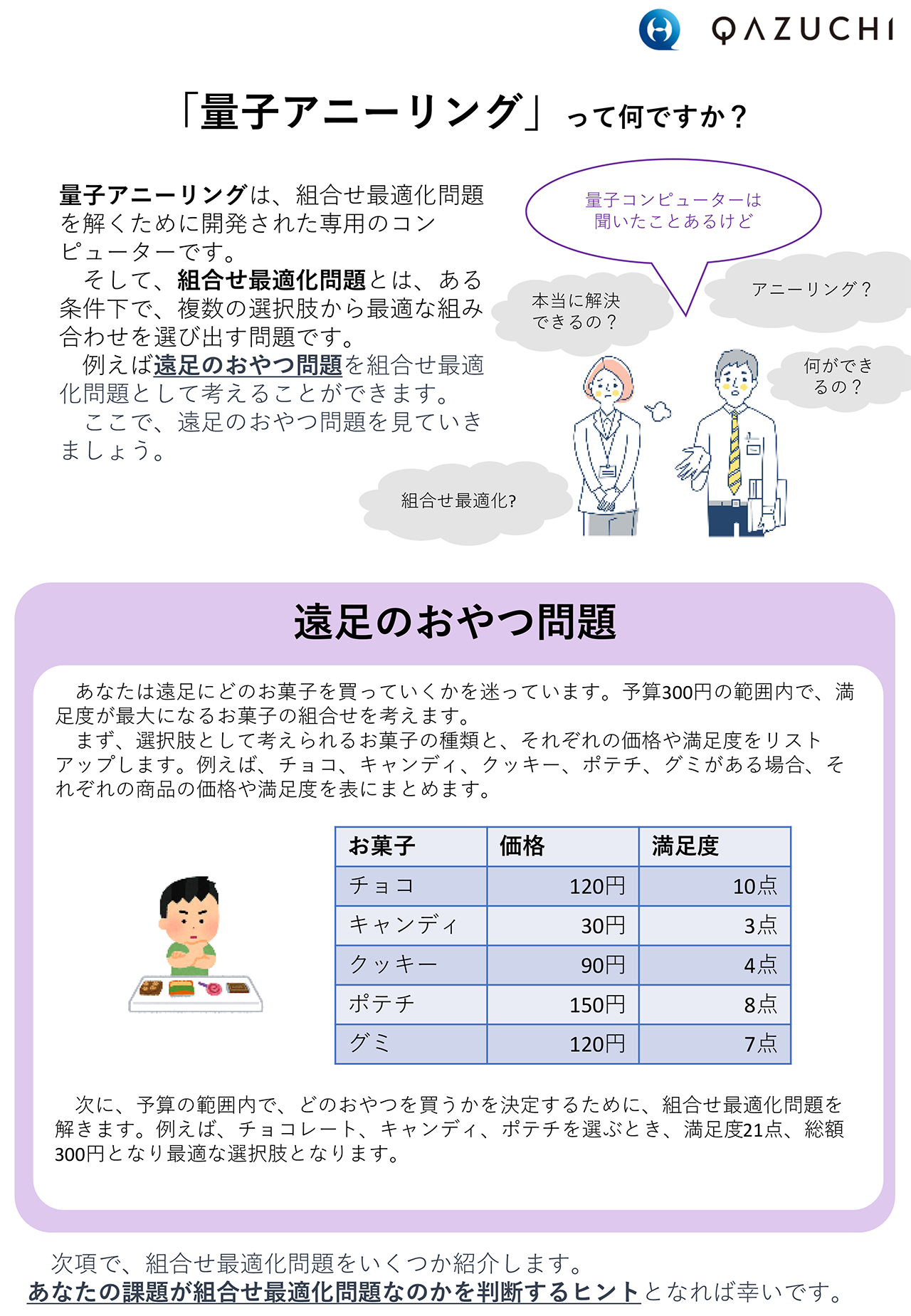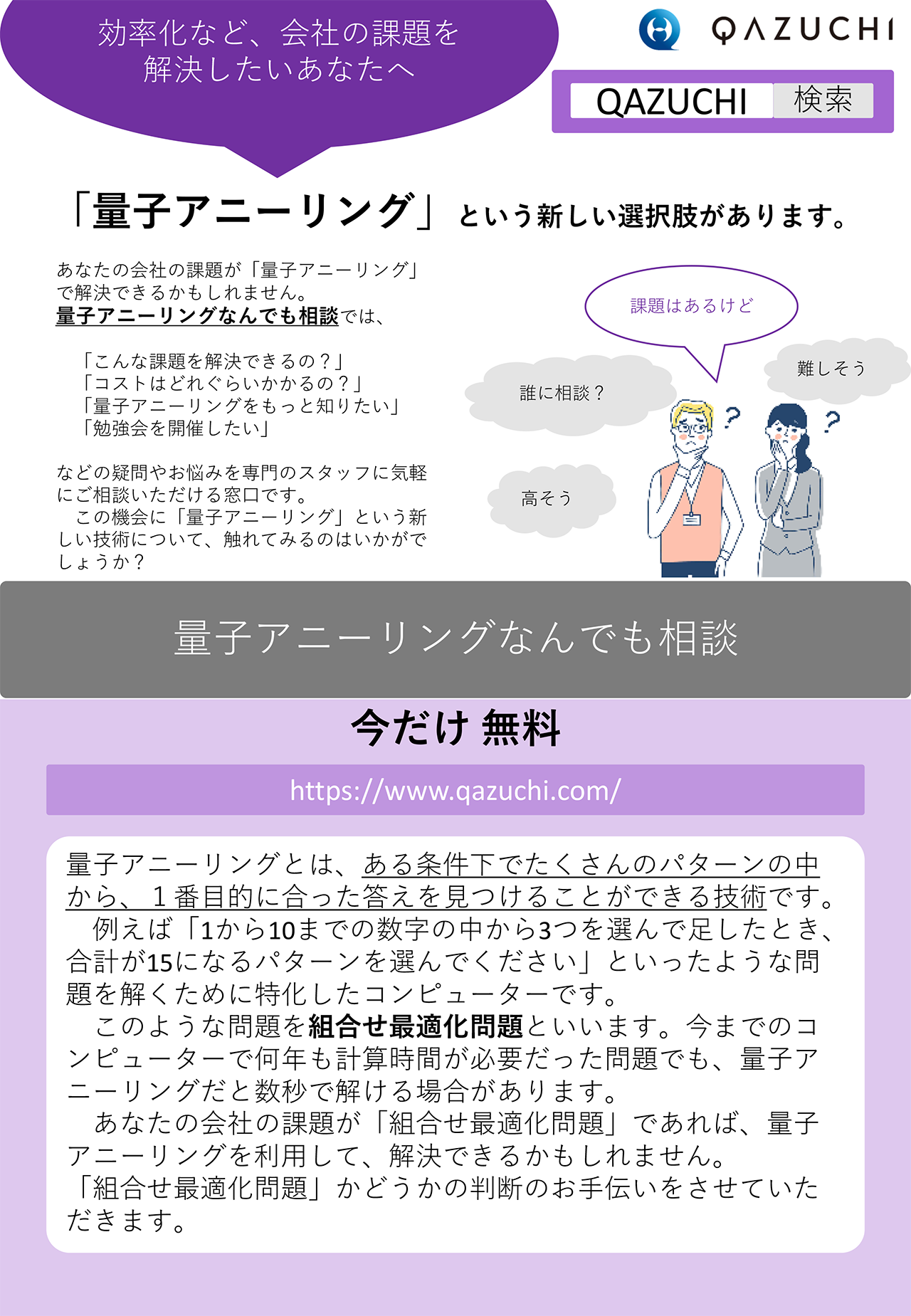 - 上記各QAZUCHIのサービス開始に先駆け、期間限定で今だけ無償で量子アニーリングに関するどのような質問でも専門家が受け付けるサービスとして『量子アニーリングなんでも相談』を行う。