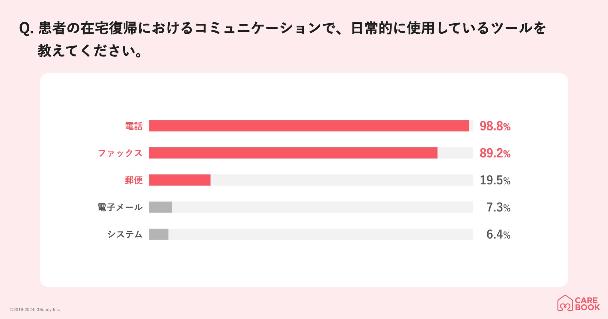 病院スタッフが訪問看護や訪問診療、クリニック等とのコミュニケーションにおいて日常的に使用するツールとしては、電話が98.9%、ファックスが89.2%、次いで郵便が19.5%という回答で、アナログコミュニケーションが中心であることがわかりました。
