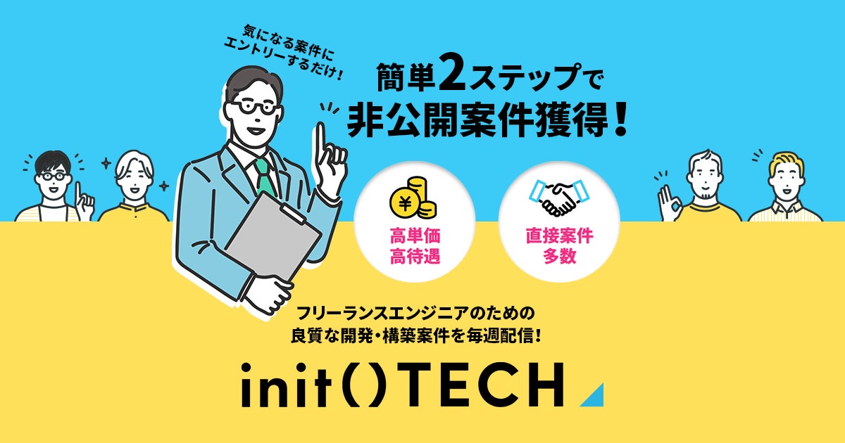 一方「init TECH」ではエンドクライアントからinit株式会社が案件を受注し、エンジニアとクライアントを直接結びつけます。これによって中間手数料の発生を最小限に抑え、高待遇・高単価な案件を実現させています。