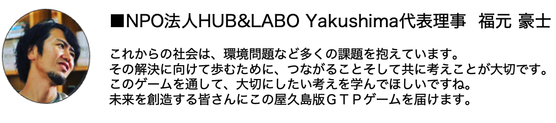 | 協力 | NPO法人 HUB&LAB Yakushima イマジン屋久島 日テレアックスオン |