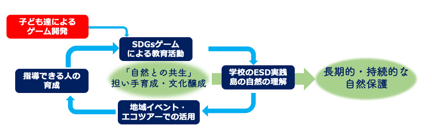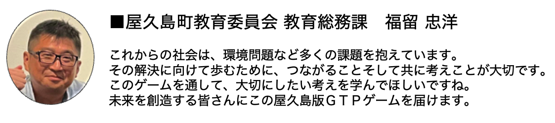 さらに普段交流のない団体同士がゲームをきっかけにつながったり、地域の課題を自分ゴトとして捉え行動を起こしたり、地域プラットフォーム(≒ローカルSDGs)の構築に取り組みます。そこから屋久島の資産を生かしたSDGs修学旅行やワーケーション等のローカルインキュベーションを次々と創出し、そのアウトプットが子どもたちの学びに活かされていくような循環を生み出していきたいと考えています。