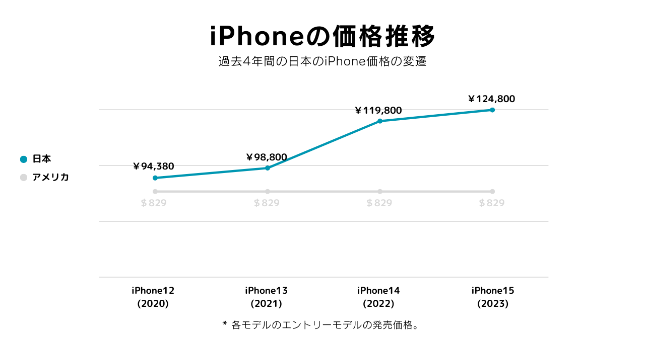 iPhone 12以降、日本のiPhoneは毎年価格が上昇し、iPhone 12からiPhone 15の間に30,420円価格が上昇。アメリカの価格は一貫して829ドルを維持しています。ただし、iPhone15 Pro Maxに関してのみ、アメリカでも100ドルの価格上昇が確認されました。