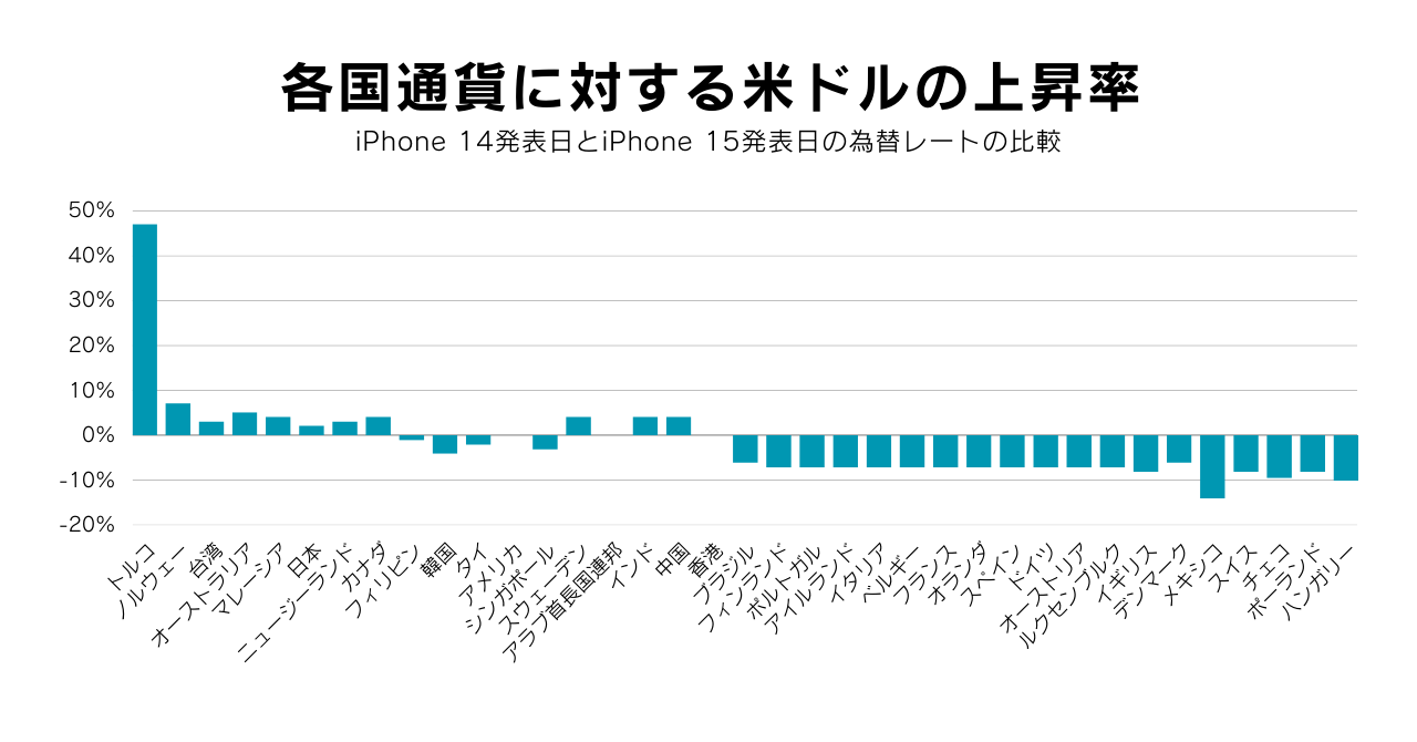 iPhone 15の各国値上げ率と米ドルの上昇率を比べてみると、多くの国でiPhone価格が為替と連動していることがわかります。ドル高が進んだにもかかわらず価格が据え置かれた中国、インド、スウェーデンの3か国では、アップルがドル高のコストを吸収した可能性があります。アップルは過去に、販売促進を目的として一部地域の価格設定に1年前のレートを適用した例があります。