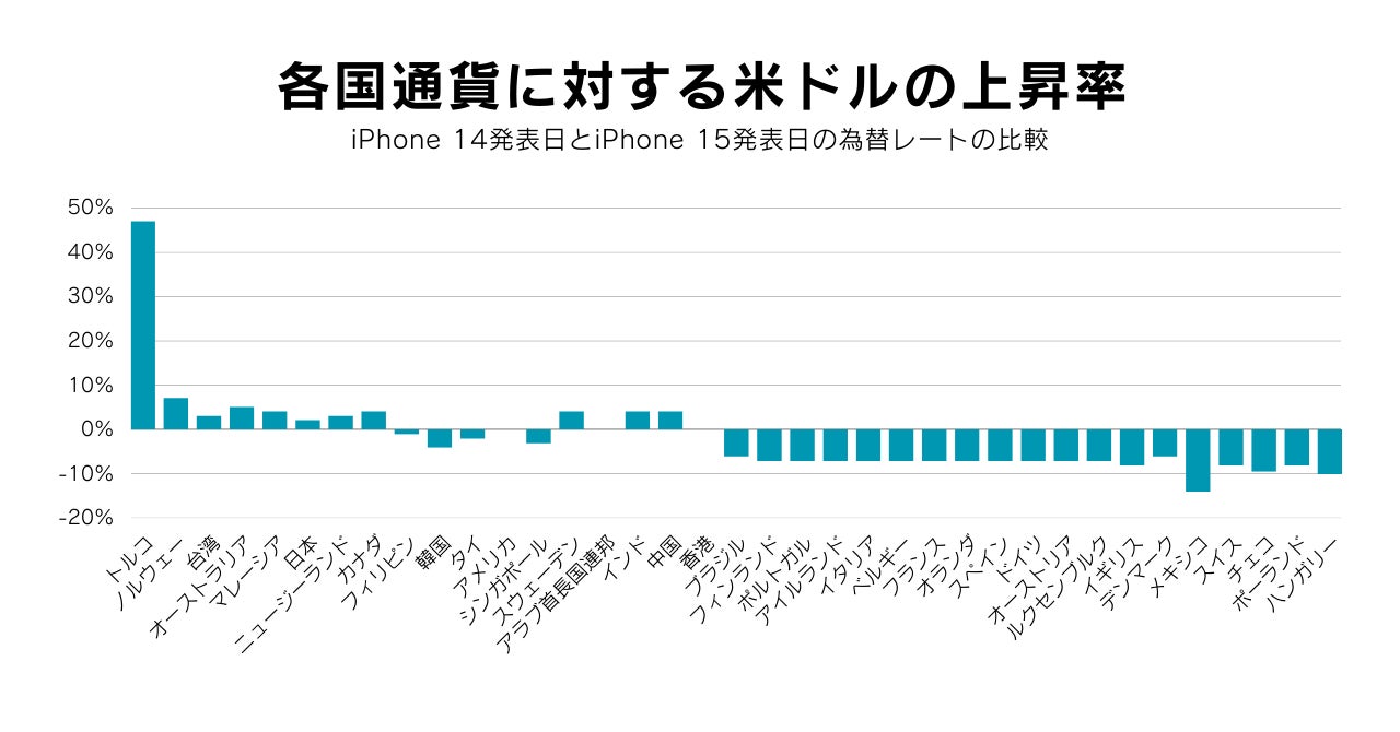 日本におけるiPhone 15のエントリーモデルは、iPhone 14のエントリーモデルと比較して5,000円価格が上昇。値上げ率は4.2%で、これは世界で6番目に高い数値です。29か国が価格を維持、もしくは下降した中、日本を含む8か国で価格が上昇しました。最も高い値上げ率を記録した国はトルコで、61.3%価格が上昇しました。