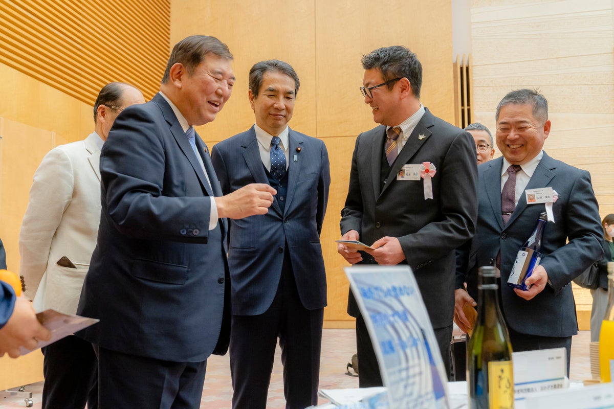 交流会では石破総理大臣をはじめ、林官房長官、江藤農林水産大臣、伊東地方創生担当大臣、青木副長官、佐藤副長官、阪田副長官補とお話しする機会を頂き、米焼酎「ねっか」もご試飲いただきました。鉄道好きを自称する石破総理大臣は、只見線ラベルのねっかにも興味津々のご様子。交流会の挨拶で総理が「戦後の強い日本、豊かな日本の次は、地方から楽しい日本を築いてください」と発言され、弊社の理念にも通じていることに嬉しさを覚えると同時に、JGAP認証の自社圃場で栽培した酒米を活用した米焼酎製造でさらなる地域貢献をしていきたいと、決意を強くしました。