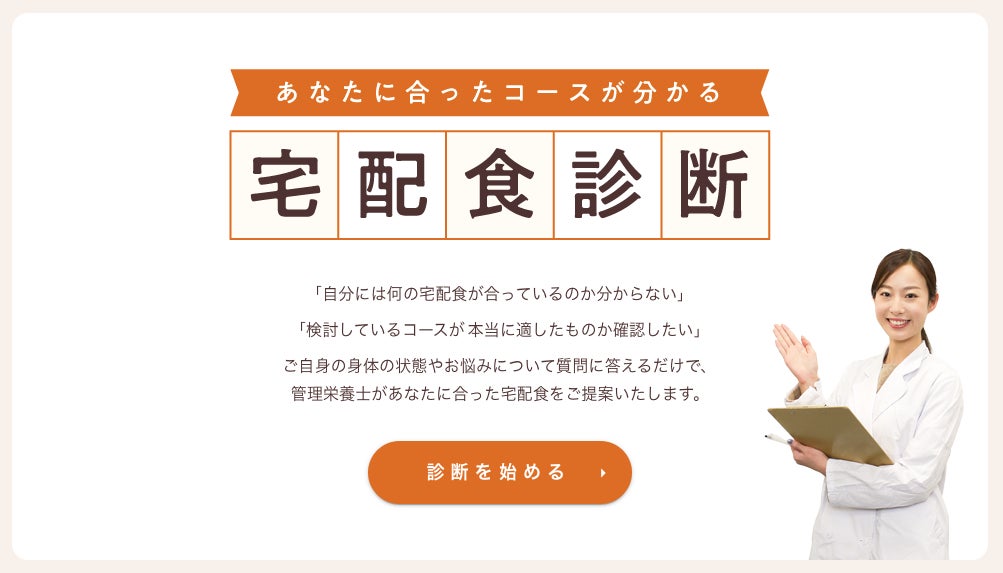 ウェルネスダイニング株式会社(本社:東京都江東区 代表取締役:長澤 眞也)は、4月26日(火)よりホームページにて、自分に合った宅配食が見つかる新コンテンツ『宅配食診断』をスタートいたしました。