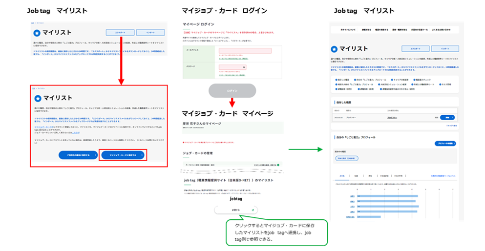職歴や資格、キャリアプランを記録するジョブ・カードをオンラインで作成・管理できるウェブサイト「マイジョブ・カード」とリンク。マイジョブ・カードからjob tagを参照したり、 job tagのマイリストをマイジョブ・カードに保存したりできるようになりました。