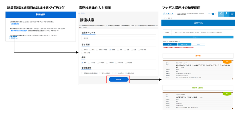 job tagで参照していた職業情報からマナパス(社会人の学び直しのため、大学等の実施する講座情報を検索できるサイト)の講座を検索することができるようになりました。希望する職業に必要なスキルや知識に関連する社会人向けの講座情報をリサーチすることができます。